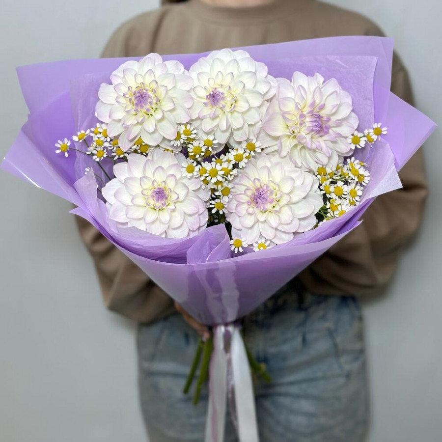 На фото букет из 5 белых георгин с ромашками. В составе: георгина 5 шт, танацетум 3 шт, дизайнерская упаковка 1 шт, атласная лента 1 шт, . Все цветы свежие и ароматные, букет красиво оформлен и отлично подходит для подарка. Доступна доставка цветов или самовывоз.